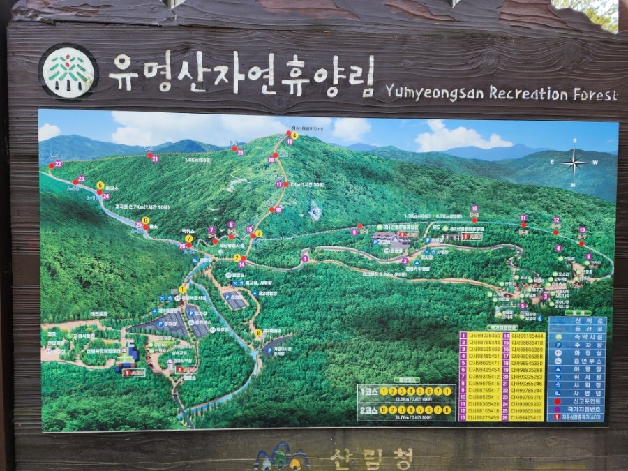 코스: 휴양림 매표소 → 중봉 → 정상 → 갈림길 → 유학리 하산 → 도로 따라 원점