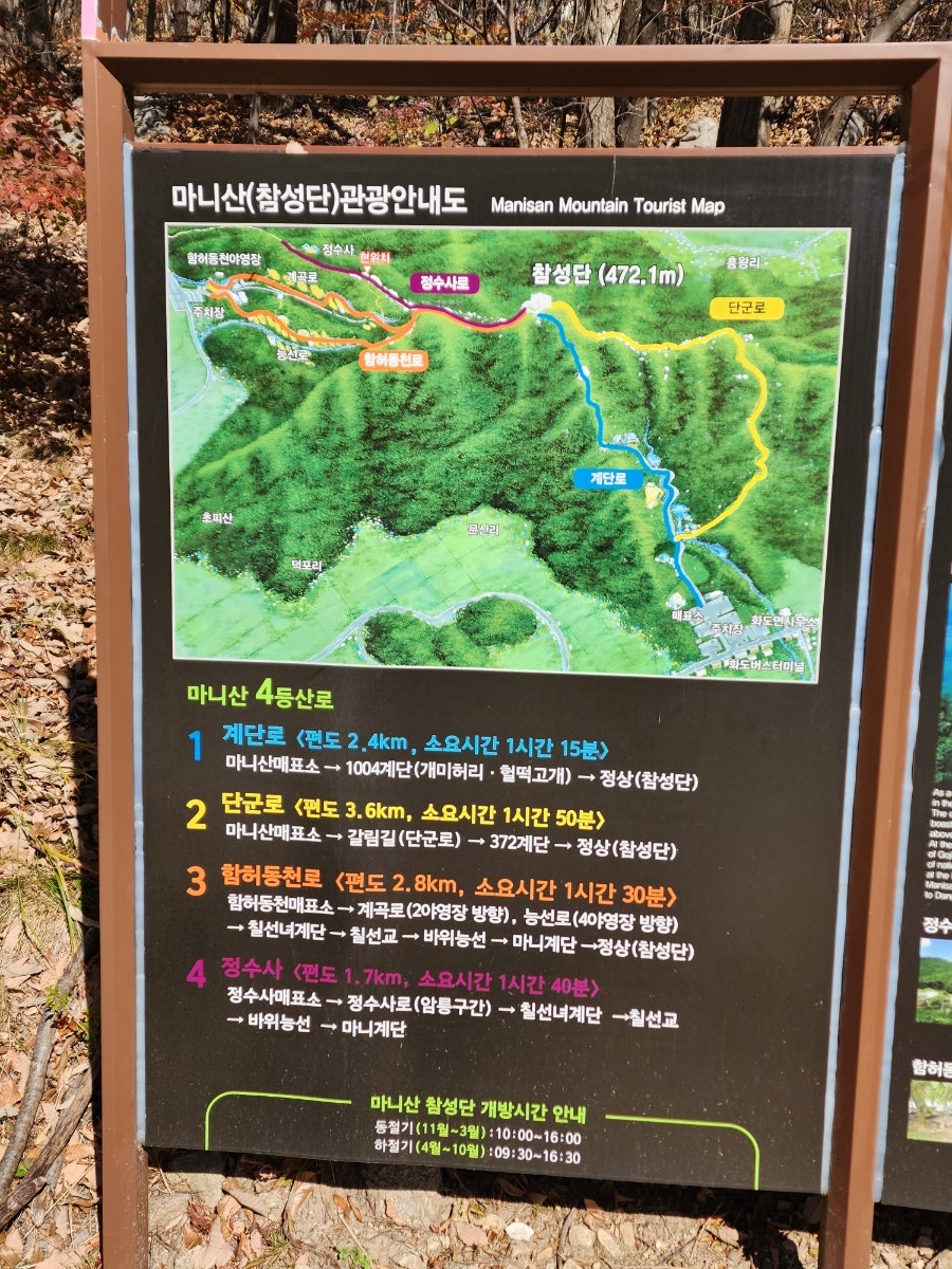 (※ 마니산은 자연공원법상 국립공원이 아니므로 계절별 통제시간은 탄력 적용되며, 군청 공지 확인 권장)