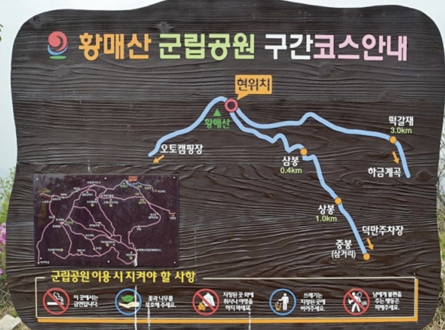 코스: 덕만주차장 → 군장산(전망대) → 철쭉군락지 → 황매산 정상 → 되돌아오기